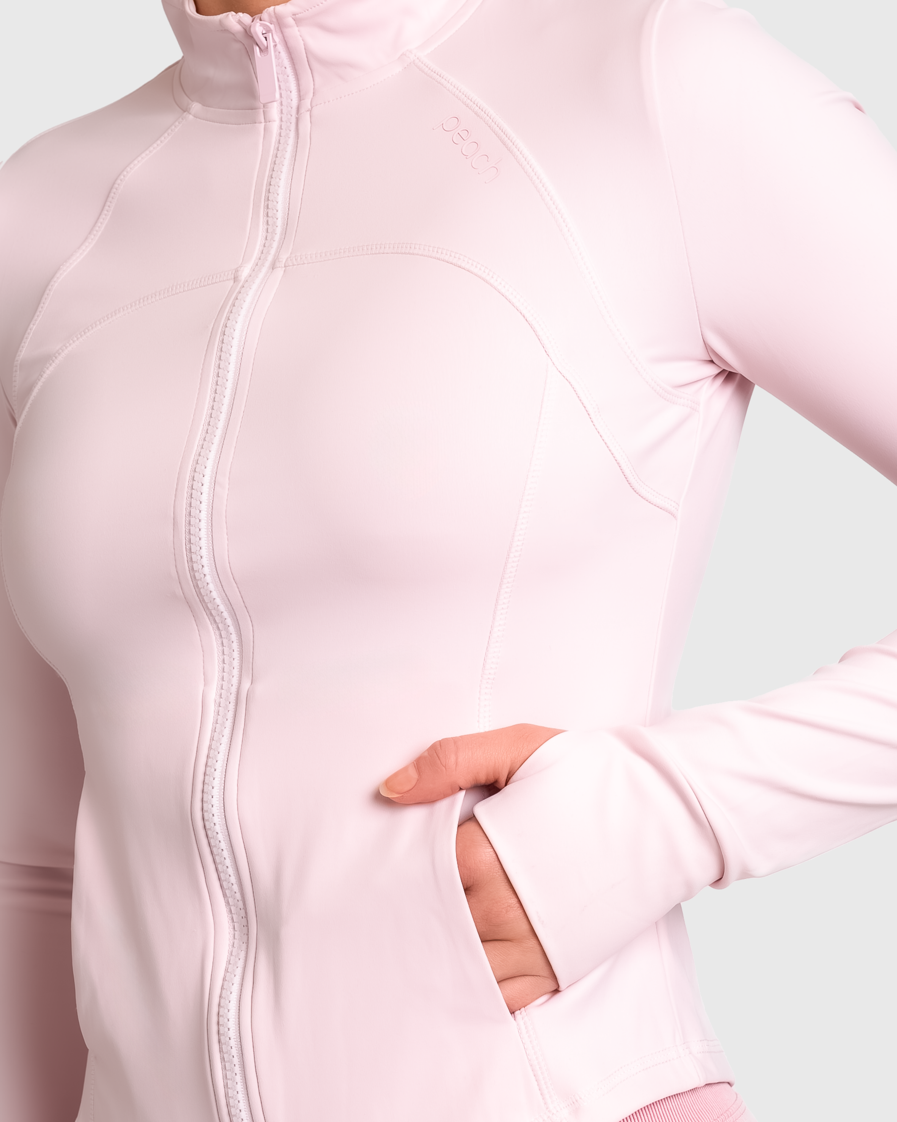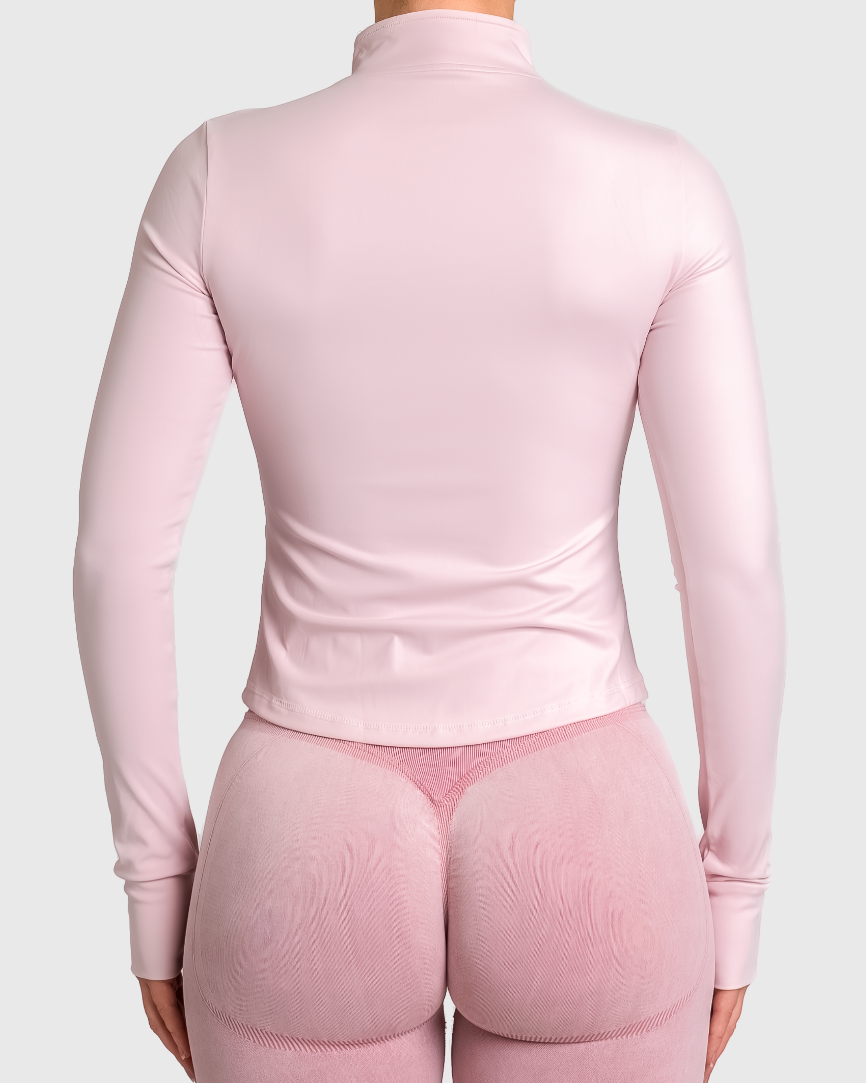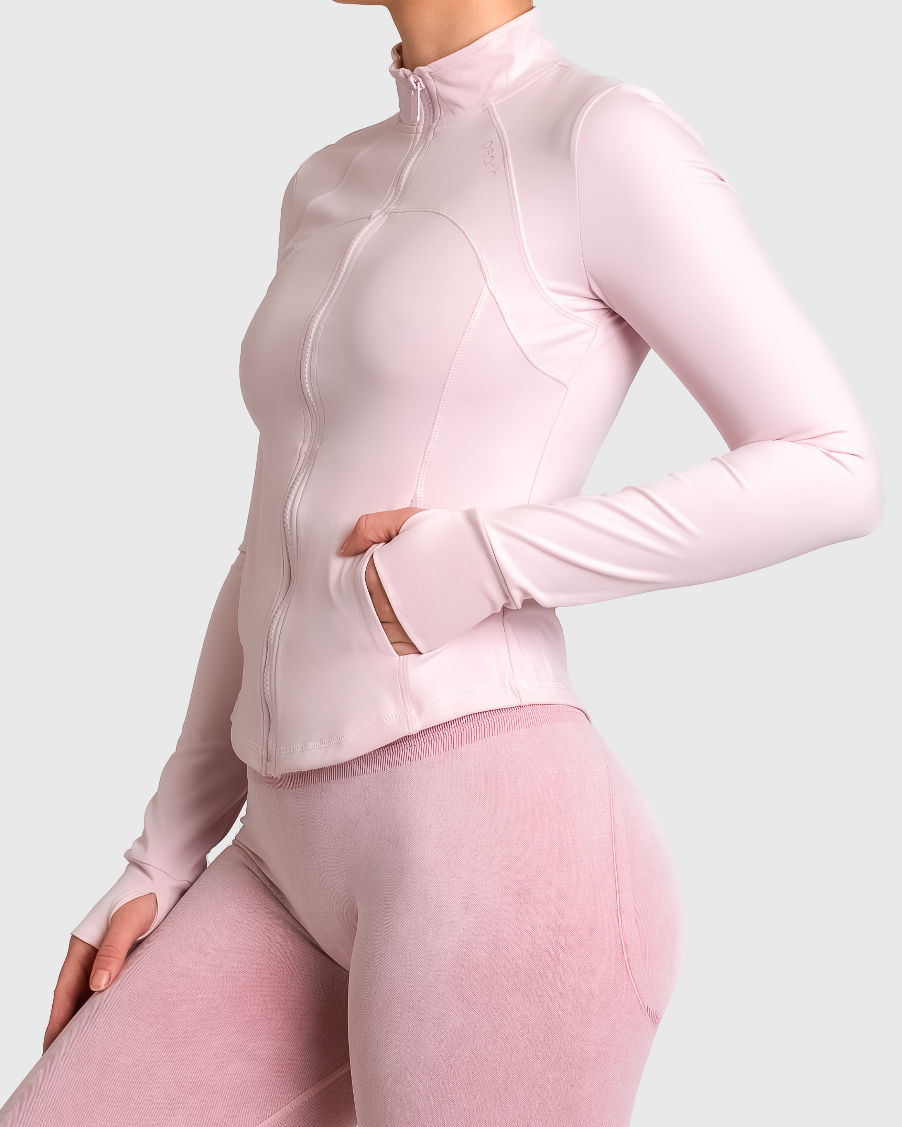 Denne jakken er laget i et luksuriøst, glatt materiale med høy stretch som gir deg full bevegelsesfrihet og en flatterende silhuett. Den sitter tett over skuldre og armer, men faller naturlig rundt midjen – akkurat passe formende, uten å stramme. Perfekt både til trening og til hverdags.
